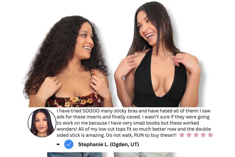 Unlike a sticky bra that is supported by the adhesive, Sticky Bra Inserts are supported by the clothing and cannot stay up by themselves. It is crucial to wear them in tight, structured, and fitted tops!